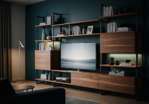 Подвесные тумбы — отличный выбор. Они не «съедают» пространство пола, создавая ощущение легкости и упрощая уборку. Открытые полки рядом с телевизором можно использовать для книг, декора или небольшой аудиотехники, но с ними важна умеренность. Перегруженные полки создают визуальный хаос. При выборе мебели стоит учитывать несколько моментов: