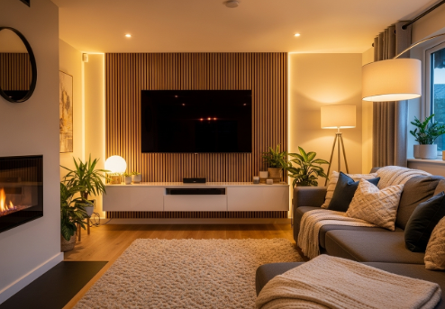 Пустая окрашенная стена за телевизором — самое простое, но и самое скучное решение. Эта поверхность — настоящий холст для дизайнера. Использование других фактур или цветов позволяет выделить нужную область, добавить глубины и характера. Декоративные панели из дерева или МДФ мгновенно добавляют тепла и уюта. Их можно расположить вертикально, горизонтально или даже создать сложный геометрический узор. Такое оформление зоны телевизора сразу переводит ее из утилитарной в декоративную.